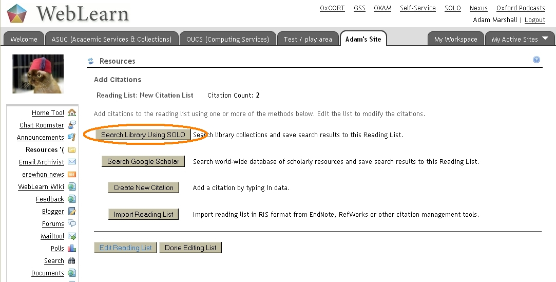 The Sir Louie project will integrate the Bodleian Libraries’ SOLO search interface with the Reading List tool; this tool is part of the Resources tool.