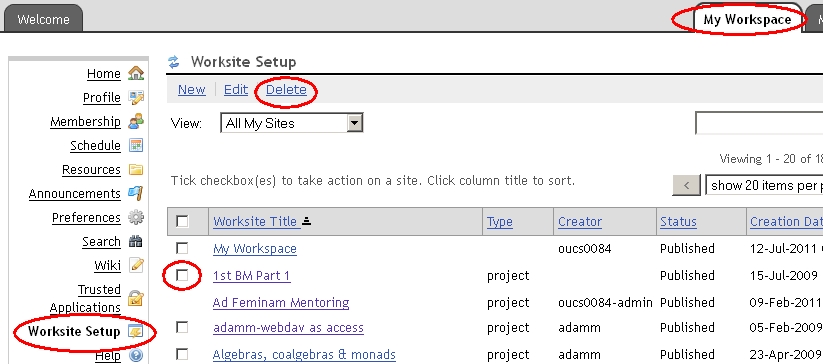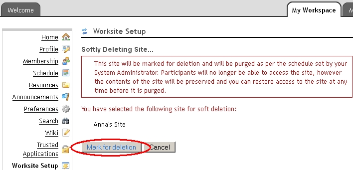 Deleting and restoring softly deleted sites is done by the individual user via their My Workspace > Worksite Setup. First of all select one or more sites and click the Delete link.