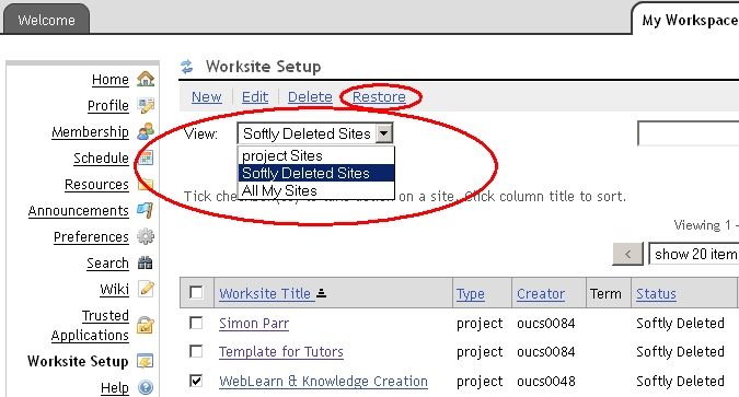 To restore a softly deleted site, also in My Workspace > Worksite Setup, choose to view your Softly Deleted Sites, which will display a Restore link.