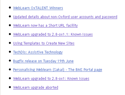 WebLearn has a built-in tool, News, for displaying RSS feeds; it is even possible to display feeds from Oxford Podcasts – these will feature an in-page media player for audio and audio-visual podcast display.