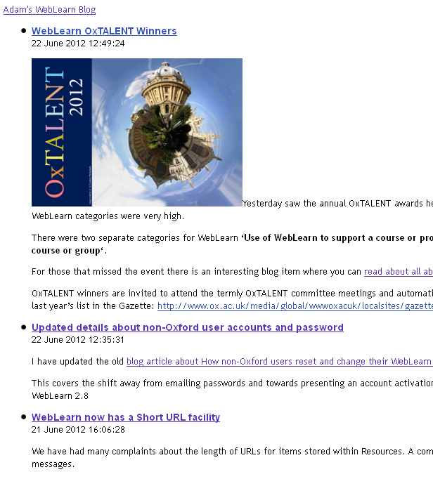 The following code snippet will display the latest 5 blog posts from the WebLearn blog. To do this you must know the URL of the RSS feed, in the following example it is http://blogs-new.it.ox.ac.uk/adamweblearn/feed/, other examples are http://feeds.bbci.co.uk/news/rss.xml (BBC news feed) and http://search.twitter.com/search.atom?q=@_markstewart (Mark Stewart’s Twitter feed).