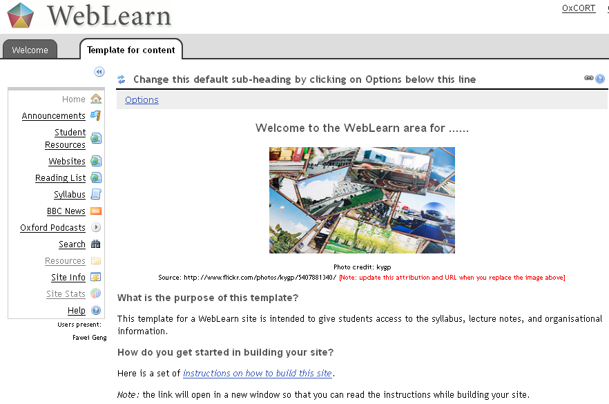 We intend to evaluate the use and usefulness of these templates and would like you to share your experience of using them. Please send your comments and suggestions to weblearn@oucs.ox.ac.uk.