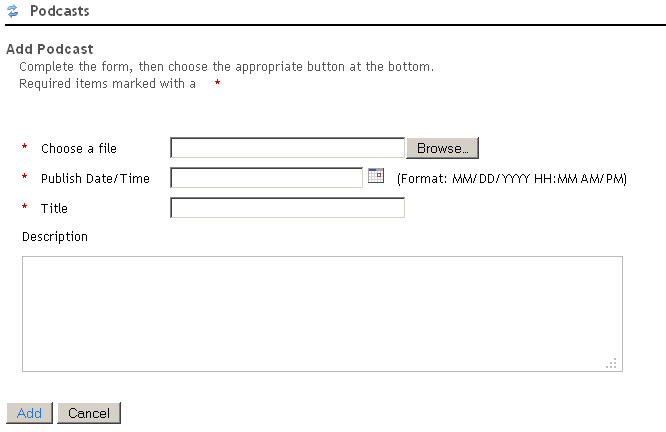 - Once you have complete the form, click the ‘Add’ button to add the media file to your podcast collection in WebLearn