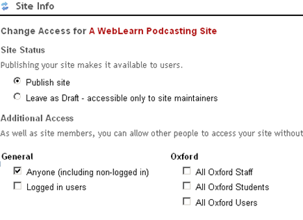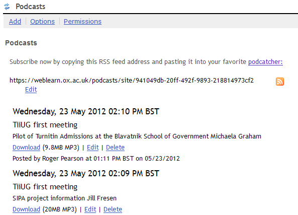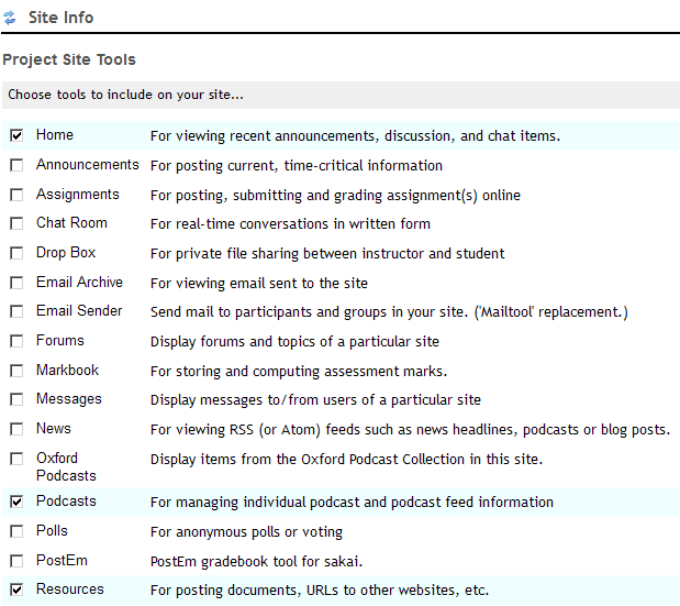 2. If they are not added in your site already, add the following WebLearn tools: Podcasts and Resources