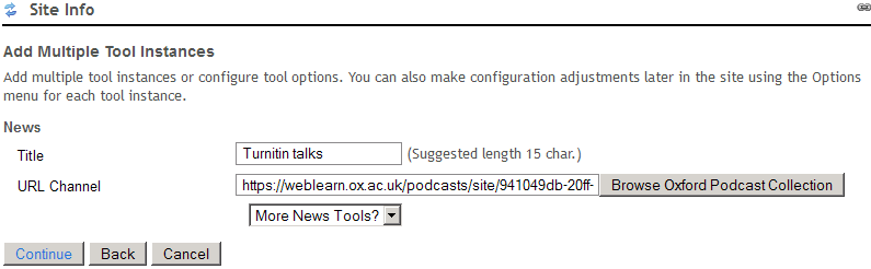 - Add the ‘News’ tool via Site Info. Replace the default Title with a descriptive one. In our case, we put ‘Turnitin talks”. For the URL channel, paste the URL copied early and click the ‘Continue’ and ‘Finish’.