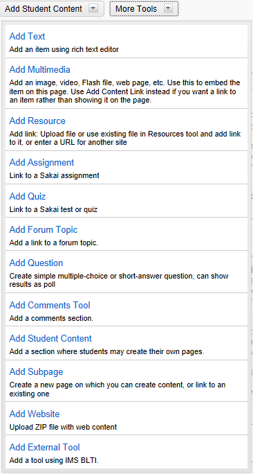 - Add Resource: upload a file or use an existing file in Resources tool and link to it, or enter a URL to another site