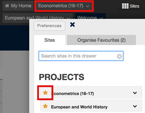 ‘Sites’ is where you can see a list of all the WebLearn sites of which you are a member; click on one of the stars next to your favourite sites and they will always appear on the Favourites bar at the top of every page.