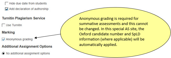 A new facility has been created within WebLearn to enable anonymous submissions (identified by student candidate number, not by name). A special WebLearn site (called an ‘anonymous submissions’ (AS) site) needs to be allocated to manage summative online submissions and, if desired, marking.