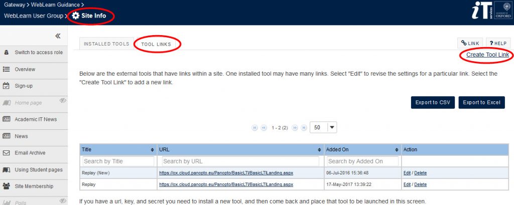 In the ‘Site Info‘ tool select ‘External Tools’; then select the ‘Tool Links’ tab and click on ‘Create Tool Link’ and select the Replay tool from the drop down menu.