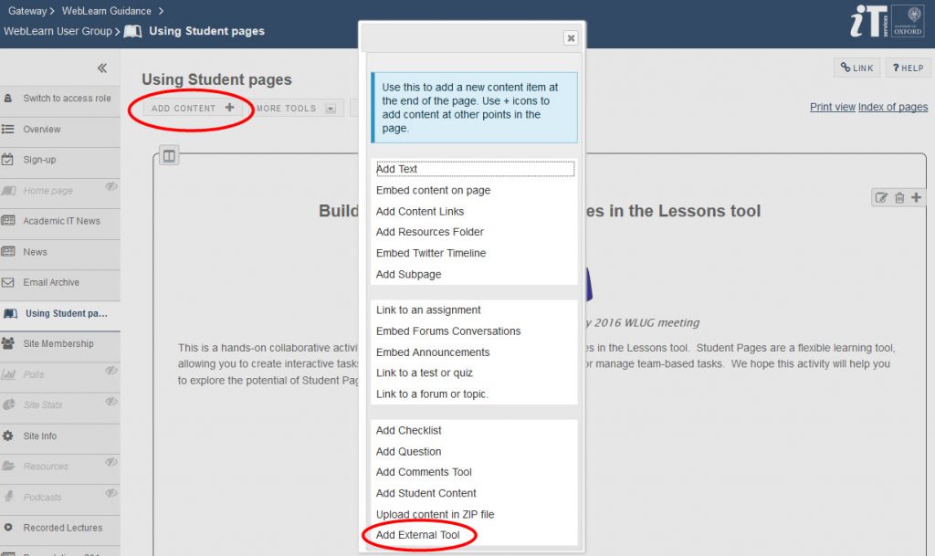 The Lessons tool is a relatively new addition to WebLearn. We recommend that all student-facing content be developed within the Lessons tool (rather than as an HTML page in Resources). Lessons is far better for developing structured ‘learning pathways’ for students and it offers better authoring capabilities compared to an HTML page (in Resources).