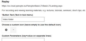 Name the link using the ‘Button Text’ box (e.g. ‘Video folder’), and choose a custom icon if you wish to replace the default icon. For this example, we will leave the ‘Custom Parameters’ box blank (this option allows you to provide the URL and link to a particular recording within Panopto – see our separate ‘advanced options’ blog post). Click ‘Save’ at the bottom of the screen.