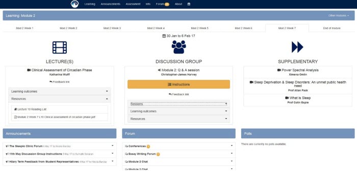 In the structure of the online modules, the WebLearn ‘Lessons tool’ was used to offer the pedagogical advantage of tailoring a learning pathway for the students, with integrated content, relevant activities and assessment opportunities.