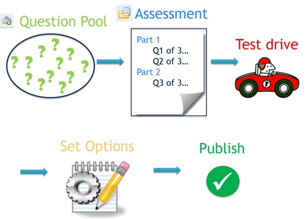 - Build an assessment by selecting questions to present (either sequentially or randomly)