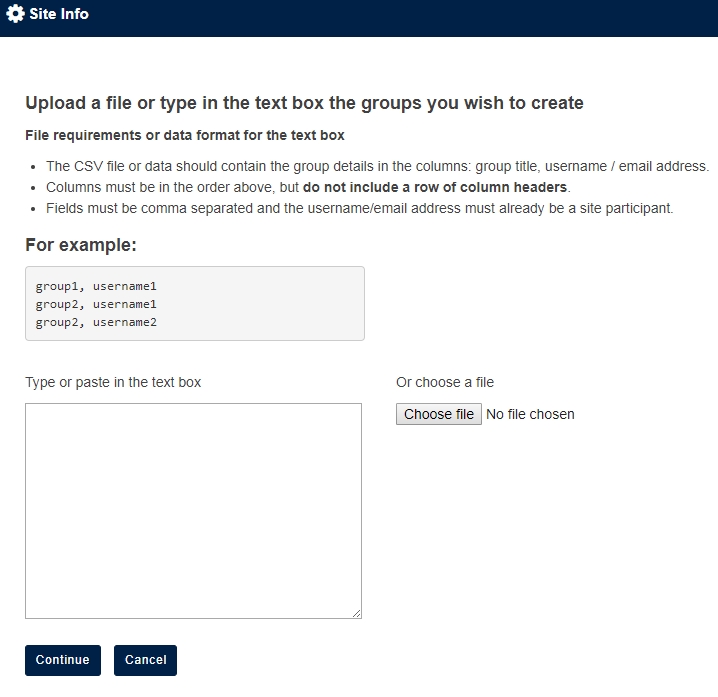 This release sees big improvements in the area of bulk creation of sub-groups (this is in Site Info > Manage Subgroups > Bulk Creation). It is possible to define multiple sets of groups and users in a file and have them created all at once. This facility should be particularly useful for Anonymous Submissions.