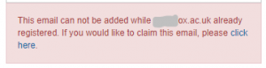 - A red box pops up, saying you cannot add the address. Click on ‘click here’ in the box. A verification email will be sent to the old address.