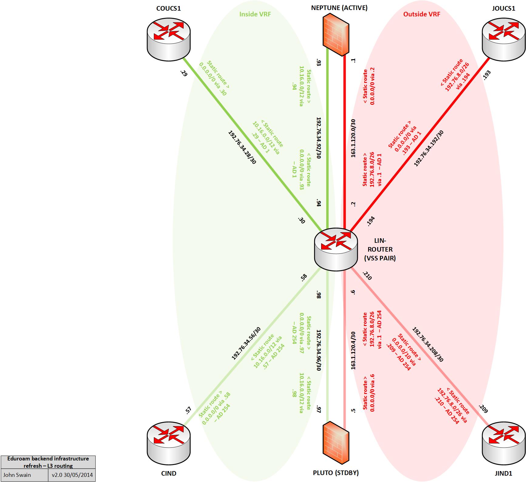 ‘Inside’ and ‘outside’ L3 routing would be kept logically separate in the new design by using Virtual Routing & Forwarding (VRF) instances. This is in place of using separate network switches to provide this function. We opted to use static routing in conjunction with the IOS object-state tracking feature to control path selection and provide a failover mechanism.