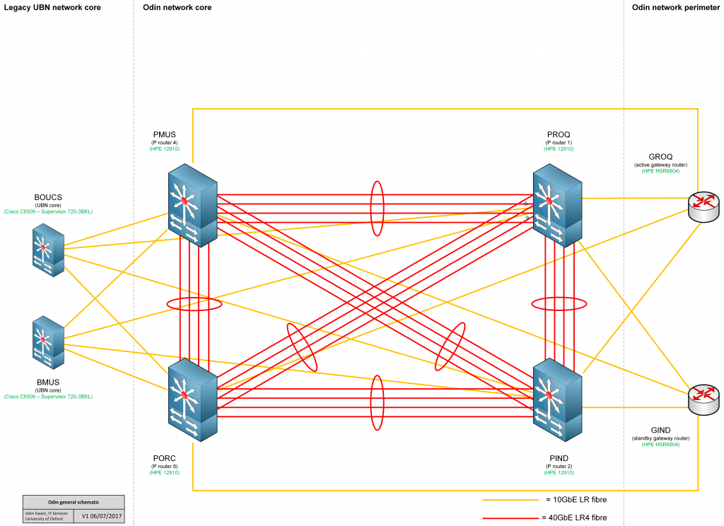 The Odin perimeter network consists of two HPE FlexNetwork HSR 6804 routers. These provide resilient connectivity between the University and the Internet via the ‘JANET’ network (maintained by JISC).