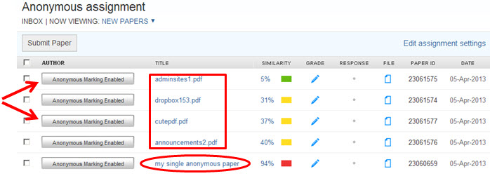 Step 5: The administrator uses the ‘Submit Paper’ option for that assignment to submit all the student papers: the choices are single file upload, multiple file upload, or zip file upload.