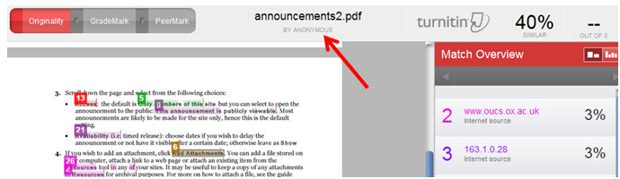 When you click on the coloured icons to access the originality reports, the anonymous ones do not reveal the candidate’s name at the top, as they would otherwise have done: