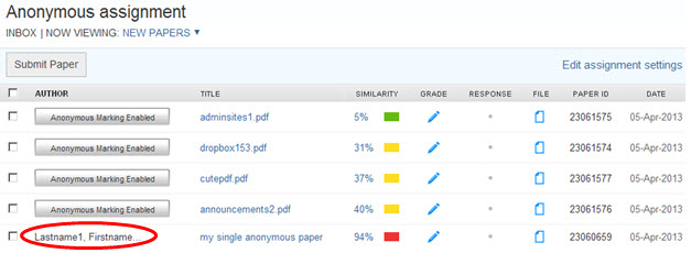 Step 6: Turnitin automatically unzips the zip file, and uses each file’s file name as the ‘title’ of the submission. It offers you the option to enter student names or candidate numbers, which are then hidden under the ‘Anonymous Marking Enabled’ button:
