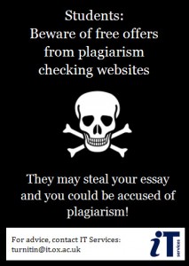 It is important that Oxford students should be strongly warned against falling victim to such offers. Students should only submit their essays to services sanctioned by Oxford University, namely WebLearn and Turnitin (via their tutor, supervisor or departmental administrator). We plan to use this poster on WebLearn pages and the student plagiarism support site, and have requested that it be made available on the Student Gateway.
