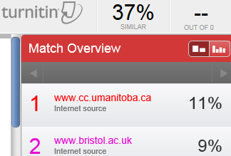 - There is no ‘magic number’, i.e. although the similarity score is colour coded red-amber-blue-green, there is no magic threshold below which we can assume that all is in order, or above which we can suspect that plagiarism may have occurred. For various reasons, it is possible for an essay to yield a fairly high score and be simply in need of remediation, or conversely to yield a low score with text matches artificially ‘engineered out’.