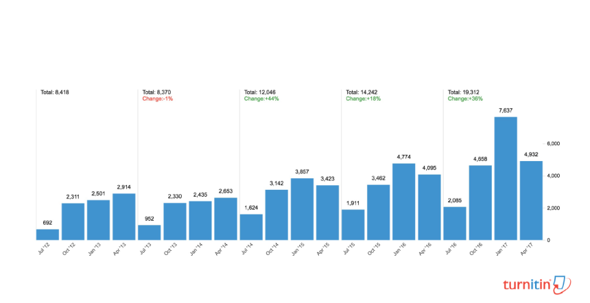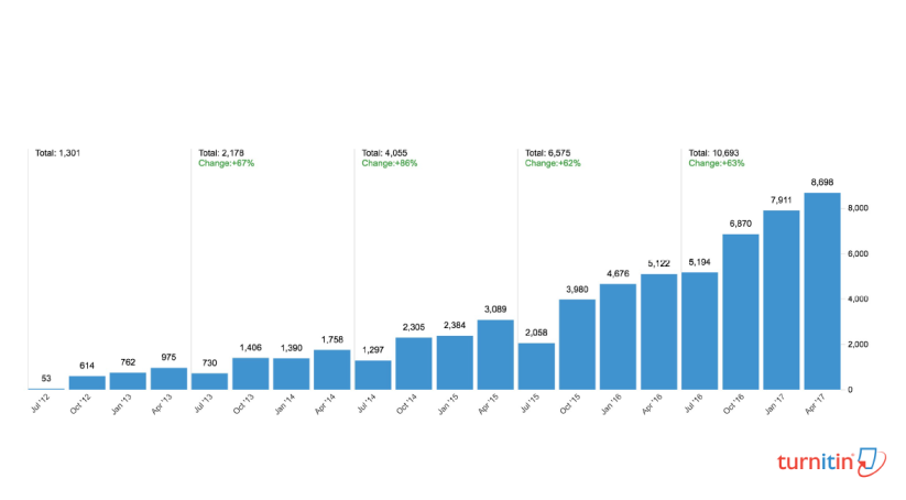 Another interesting chart shows the growth in active students over the last 5 academic years. (A student is considered active if they are enrolled in a class that has had any activity in the Turnitin system during the time period.)